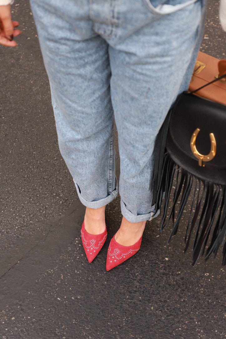 Our ICONIC Horseshoe Bag in Pebble Grain black with added fringe.